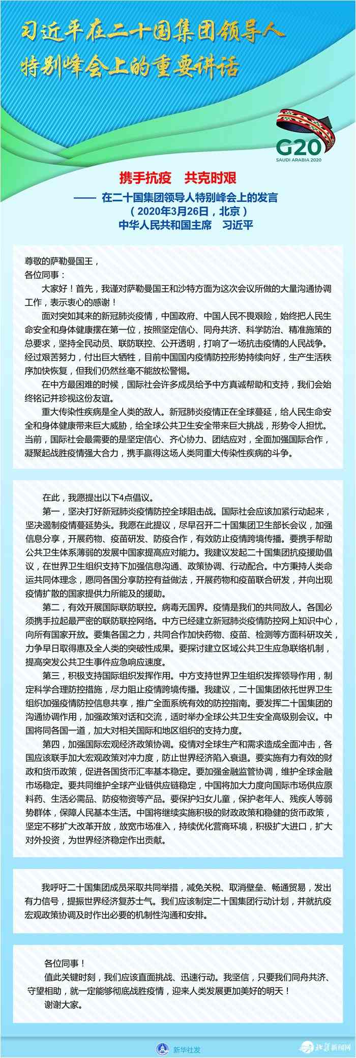 二十國集團領導人應對新冠肺炎特別峰會由沙特主辦,以視頻方式舉行,旨在推動全球合作應對疫情、穩(wěn)定世界經濟。
