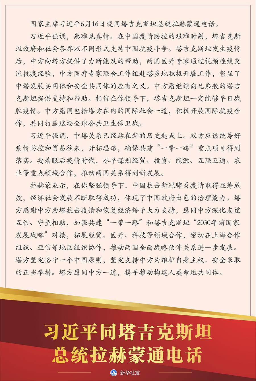 習(xí)近平強(qiáng)調(diào),患難見真情。在中國(guó)疫情防控的艱難時(shí)刻,塔吉克斯坦政府和社會(huì)各界以不同形式支持中國(guó)抗疫斗爭(zhēng)。塔吉克斯坦發(fā)生疫情后,中方向塔方提供了力所能及的幫助,兩國(guó)醫(yī)療專家通過視頻連線交流抗疫經(jīng)驗(yàn),中方醫(yī)療專家聯(lián)合工作組赴塔多地積極開展工作,彰顯了中塔發(fā)展共同體和安全共同體的應(yīng)有之義。中方愿繼續(xù)向兄弟般的塔吉克斯坦提供支持和幫助。相信在你領(lǐng)導(dǎo)下,塔吉克斯坦一定能夠早日戰(zhàn)勝疫情。中方愿同包括塔方在內(nèi)的國(guó)際社會(huì)一道,積極開展國(guó)際抗疫合作,共同打贏這場(chǎng)全球公共衛(wèi)生保衛(wèi)戰(zhàn)。