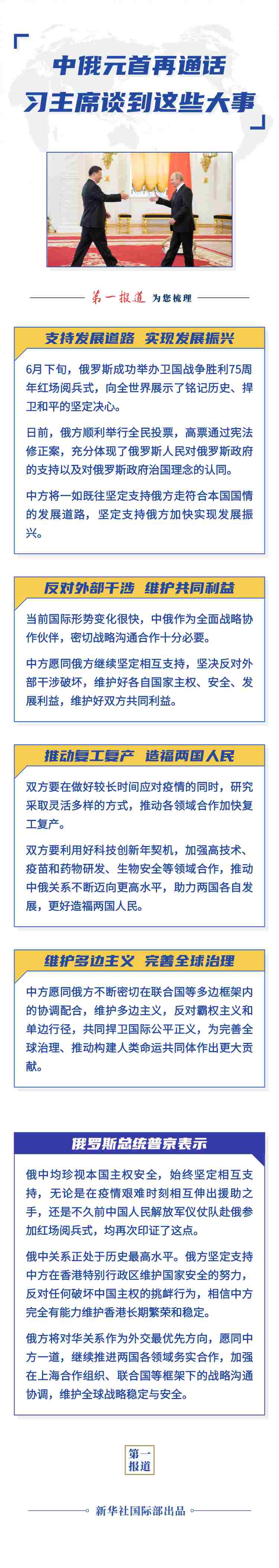 習(xí)近平指出,6月下旬,俄羅斯成功舉辦衛(wèi)國戰(zhàn)爭勝利75周年紅場閱兵式,向全世界展示了銘記歷史、捍衛(wèi)和平的堅定決心。日前,俄方順利舉行全民投票,高票通過憲法修正案,充分體現(xiàn)了俄羅斯人民對俄羅斯政府的支持以及對俄羅斯政府治國理念的認同。中方將一如既往堅定支持俄方走符合本國國情的發(fā)展道路,堅定支持俄方加快實現(xiàn)發(fā)展振興。