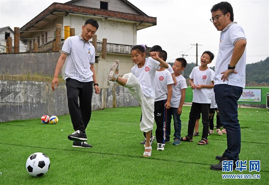 在江西省貴溪市金屯鎮(zhèn)金屯村渡坊村小組,志愿者和留守兒童一起進(jìn)行體育活動(5月27日攝)。新華社記者萬象攝