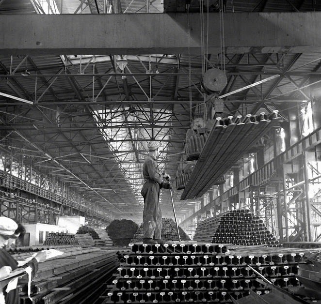 “一五”期間,鞍鋼興建的第一座大型軋鋼廠生產(chǎn)能力已迅速超過(guò)設(shè)計(jì)標(biāo)準(zhǔn)。這是這個(gè)廠生產(chǎn)的大批鋼軌(攝于1957年4月)。