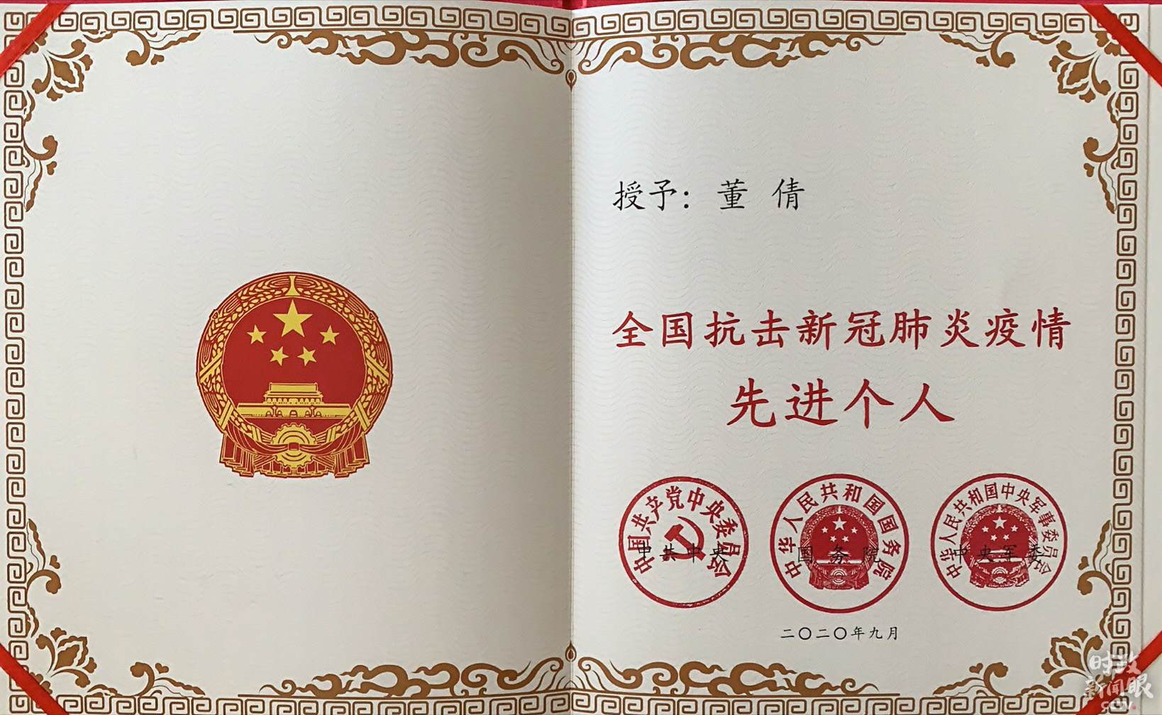 △全國抗擊新冠肺炎疫情先進(jìn)個(gè)人獎(jiǎng)?wù)潞妥C書。(總臺(tái)央視記者張淳拍攝)