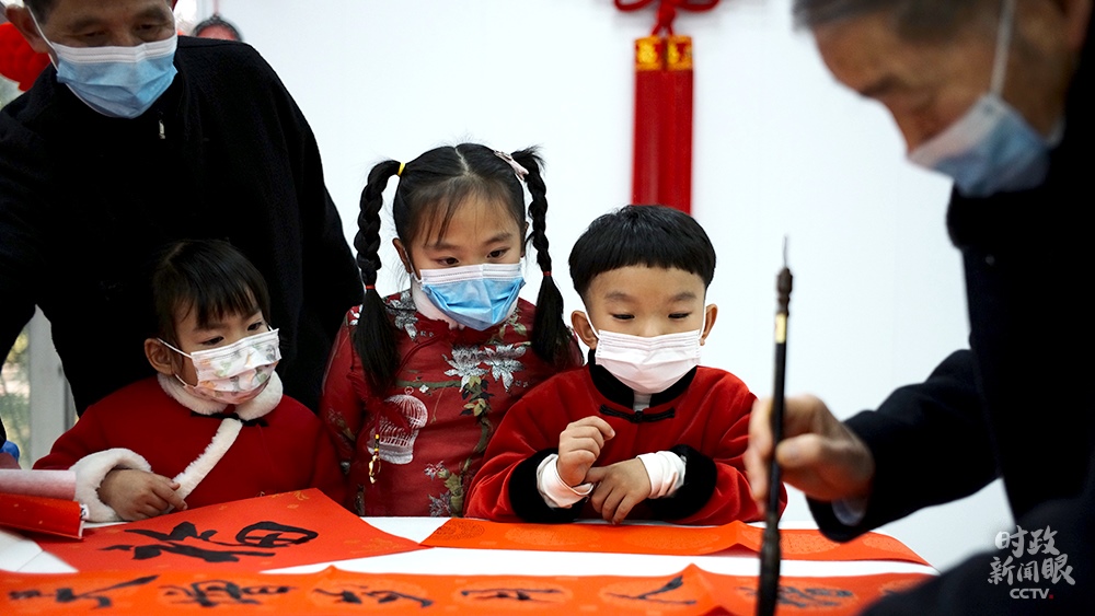 △金元社區(qū)居民活動(dòng)室內(nèi),孩子們觀摩書(shū)法寫(xiě)作。(總臺(tái)央視記者王哈男拍攝)