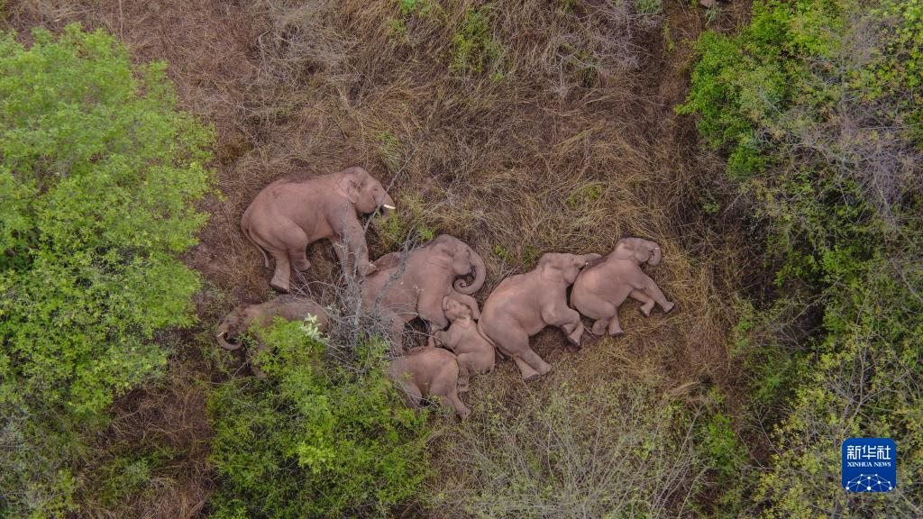 6月7日在云南省昆明市晉寧區(qū)夕陽(yáng)彝族鄉(xiāng)拍攝的野象(無人機(jī)照片)。新華社發(fā)