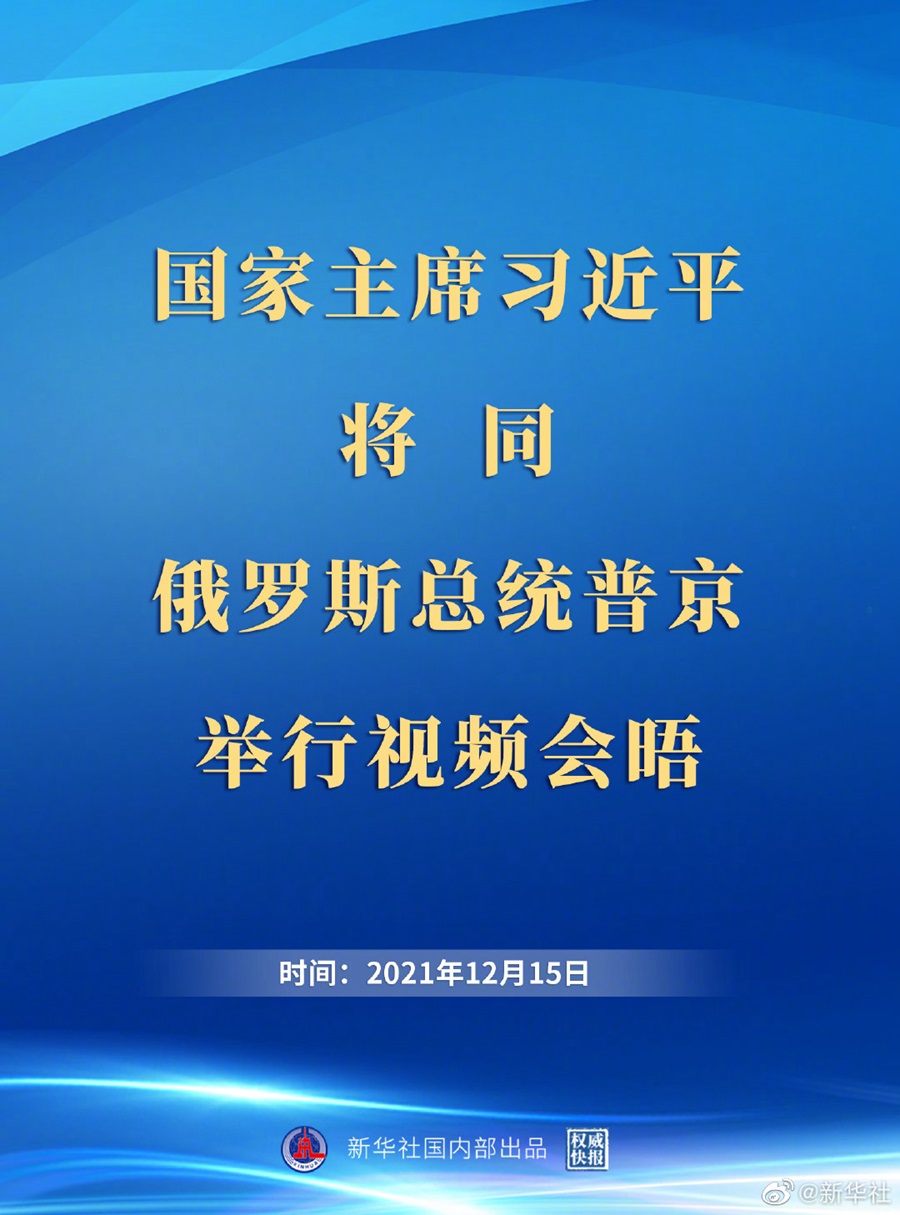 外交部發(fā)言人華春瑩12月13日宣布:國家主席習近平將于12月15日在北京同俄羅斯聯(lián)邦總統(tǒng)普京舉行視頻會晤。