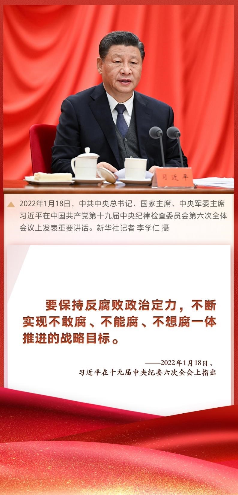 “要保持反腐敗政治定力,不斷實(shí)現(xiàn)不敢腐、不能腐、不想腐一體推進(jìn)的戰(zhàn)略目標(biāo)?!敝泄仓醒肟倳?、國(guó)家主席、中央軍委主席習(xí)近平在十九屆中央紀(jì)委六次全會(huì)上發(fā)表重要講話,深刻總結(jié)新時(shí)代黨的自我革命的成功實(shí)踐,深刻闡述全面從嚴(yán)治黨取得的歷史性、開創(chuàng)性成就,產(chǎn)生的全方位、深層次影響,對(duì)堅(jiān)持不懈把全面從嚴(yán)治黨向縱深推進(jìn)、迎接黨的二十大勝利召開作出戰(zhàn)略部署。