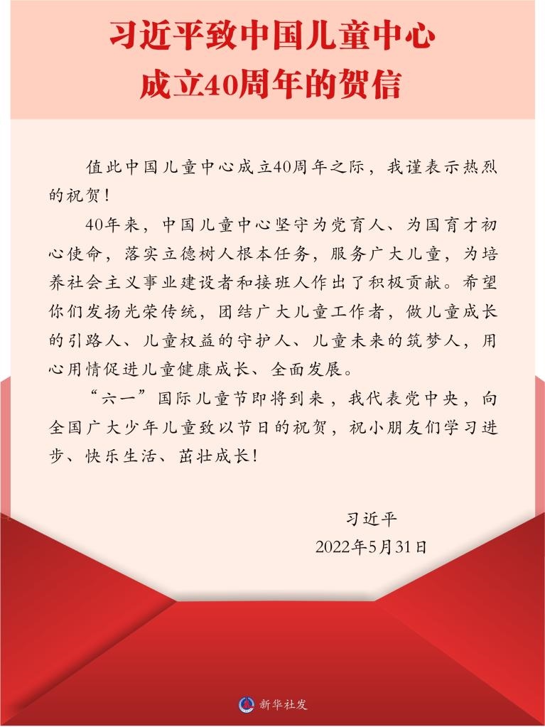 40年來,中國兒童中心堅守為黨育人、為國育才初心使命,落實立德樹人根本任務,服務廣大兒童,為培養(yǎng)社會主義事業(yè)建設者和接班人作出了積極貢獻。希望你們發(fā)揚光榮傳統(tǒng),團結廣大兒童工作者,做兒童成長的引路人、兒童權益的守護人、兒童未來的筑夢人,用心用情促進兒童健康成長、全面發(fā)展。