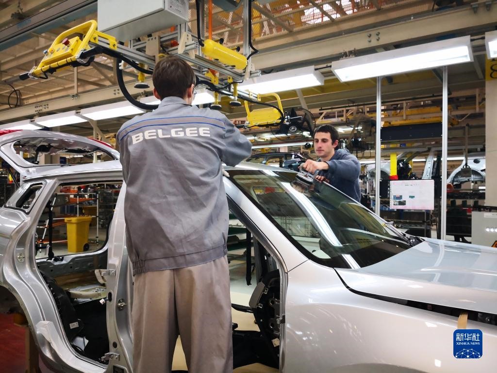 在白俄羅斯首都明斯克東北方向50公里處的白俄羅斯吉利全散件汽車制造廠總裝車間,工人組裝車體(2018年12月1日攝)。新華社記者張若玄攝