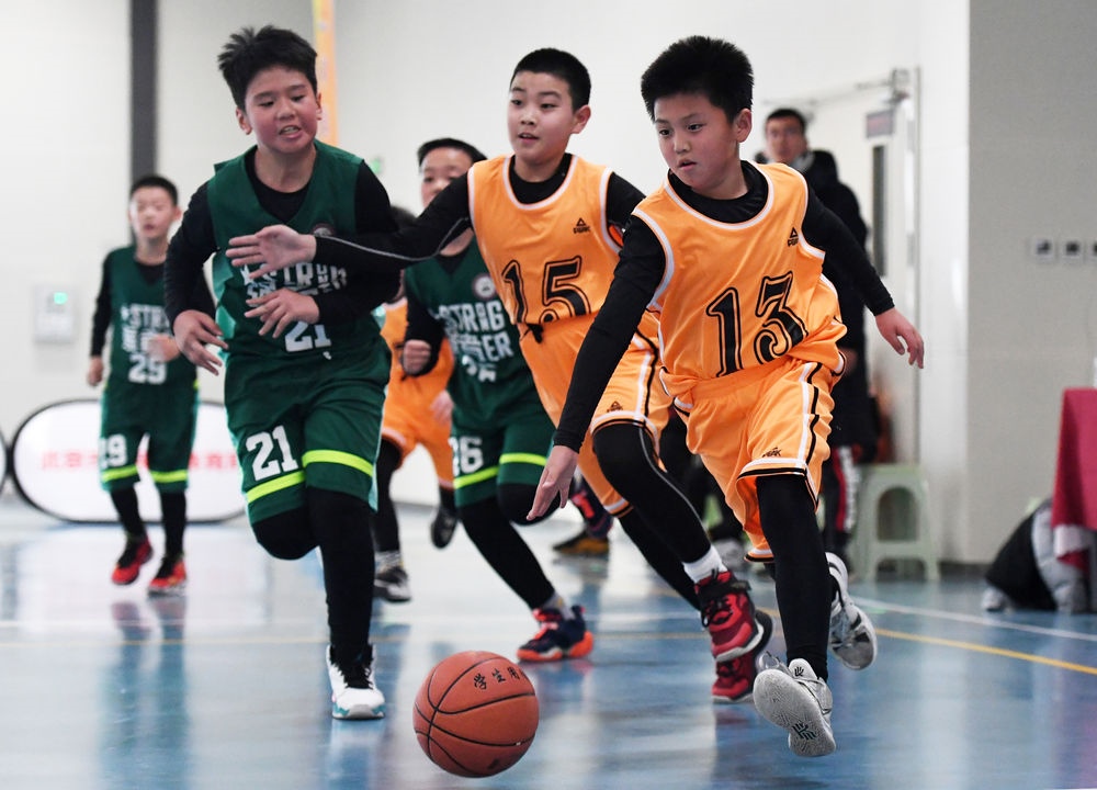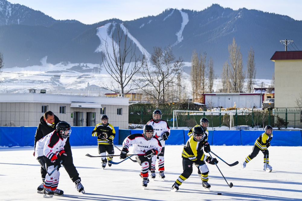 ↑新疆烏魯木齊市烏魯木齊縣第一中學(xué)小學(xué)部冰球隊的學(xué)生在進行冰球比賽(2022年1月12日攝)。