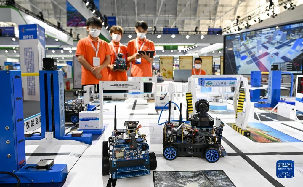 在天津舉行的世界職業(yè)技術(shù)教育發(fā)展大會首屆世界職業(yè)院校技能大賽上,參賽選手在實訓沙盤前操作機器人設備(2022年8月20日攝)。新華社記者 孫凡越 攝