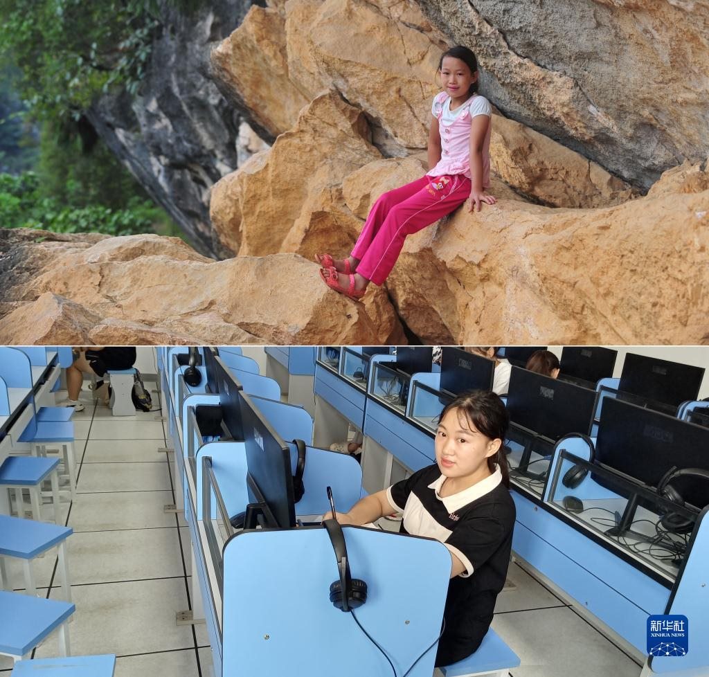 這是一張拼版照片,上圖為:在廣西大化瑤族自治縣板升鄉(xiāng)弄雷村哈保屯,11歲的蒙秋艷在懸崖邊休息,這一處約300米長的半山懸崖,是她讀小學期間每天都要走的路(2012年9月5日新華社記者黃孝邦攝);下圖為:已經(jīng)實現(xiàn)大學夢想的蒙秋艷,就讀于廣西醫(yī)科大學,這是她在學校的語音室學習(新華社發(fā),2022年9月5日韋婷婷攝)。新華社發(fā)