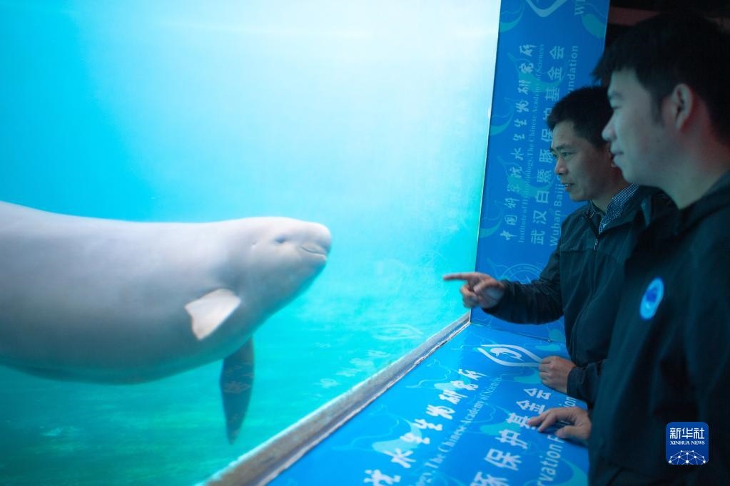 10月18日,在湖北武漢的中科院水生所白鱀豚館,長期從事長江江豚保護(hù)研究工作的郝玉江副研究員(左)在向?qū)W生講解江豚行為習(xí)慣。新華社發(fā)