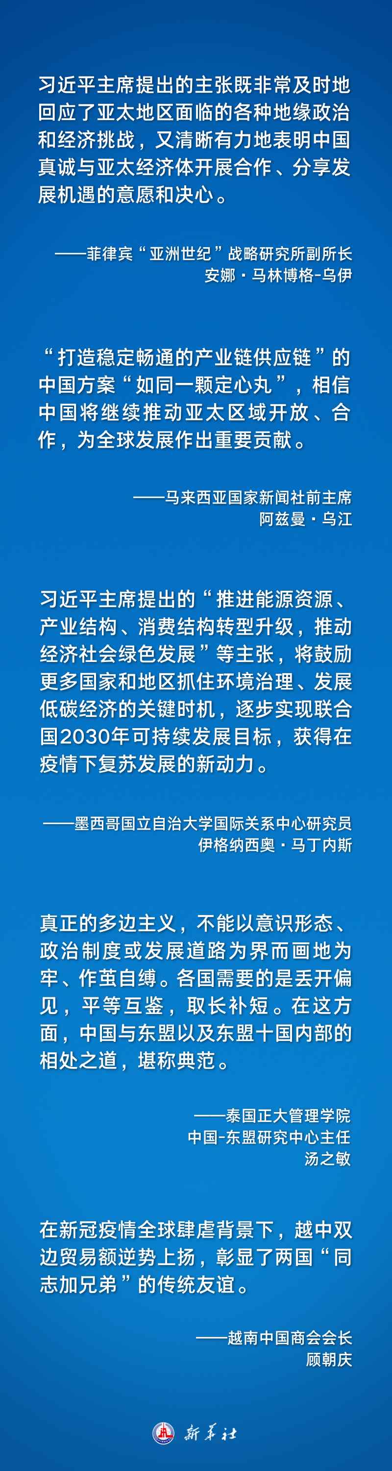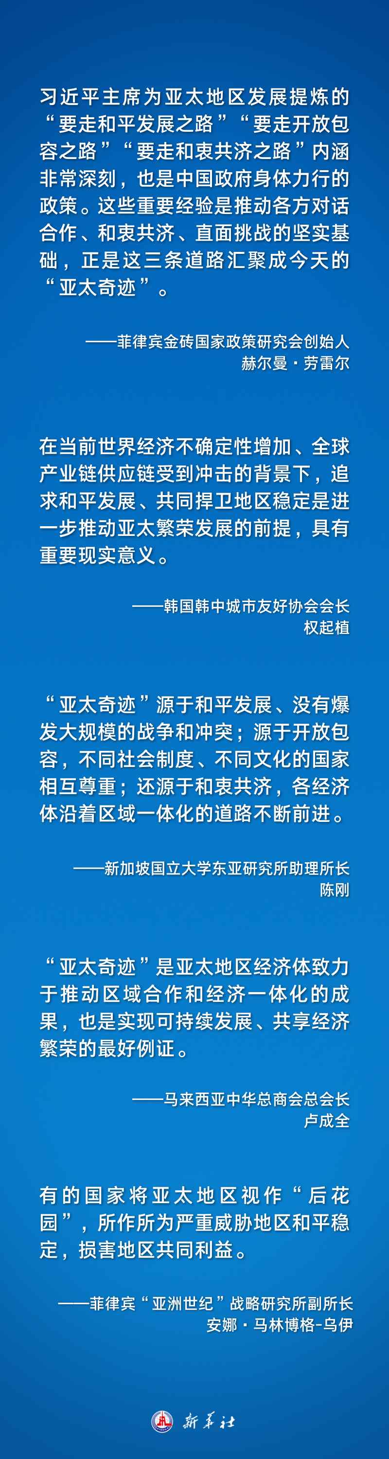 習(xí)近平主席的系列重要講話在國際社會引發(fā)熱烈反響。多國人士認(rèn)為,習(xí)近平主席全面總結(jié)了“亞太奇跡”的經(jīng)驗與啟示,就攜手構(gòu)建亞太命運(yùn)共同體提出重要主張,深刻闡釋了中國式現(xiàn)代化的機(jī)遇與貢獻(xiàn),為再創(chuàng)亞太合作新輝煌注入強(qiáng)勁動力。