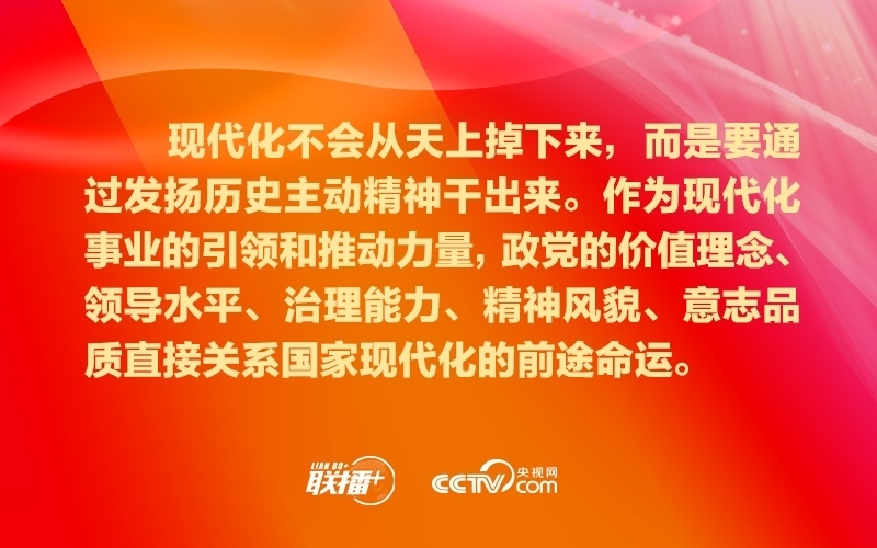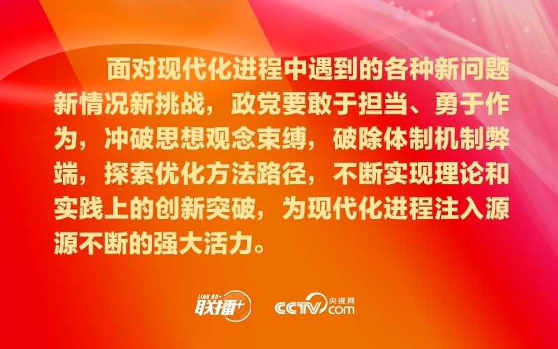 政黨要把自身建設(shè)和國家現(xiàn)代化建設(shè)緊密結(jié)合起來,踔厲奮發(fā),勇毅篤行,超越自我,確保始終有信心、有意志、有能力應(yīng)對好時代挑戰(zhàn)、回答好時代命題、呼應(yīng)好人民期盼,為不斷推進現(xiàn)代化進程引領(lǐng)方向、凝聚力量。