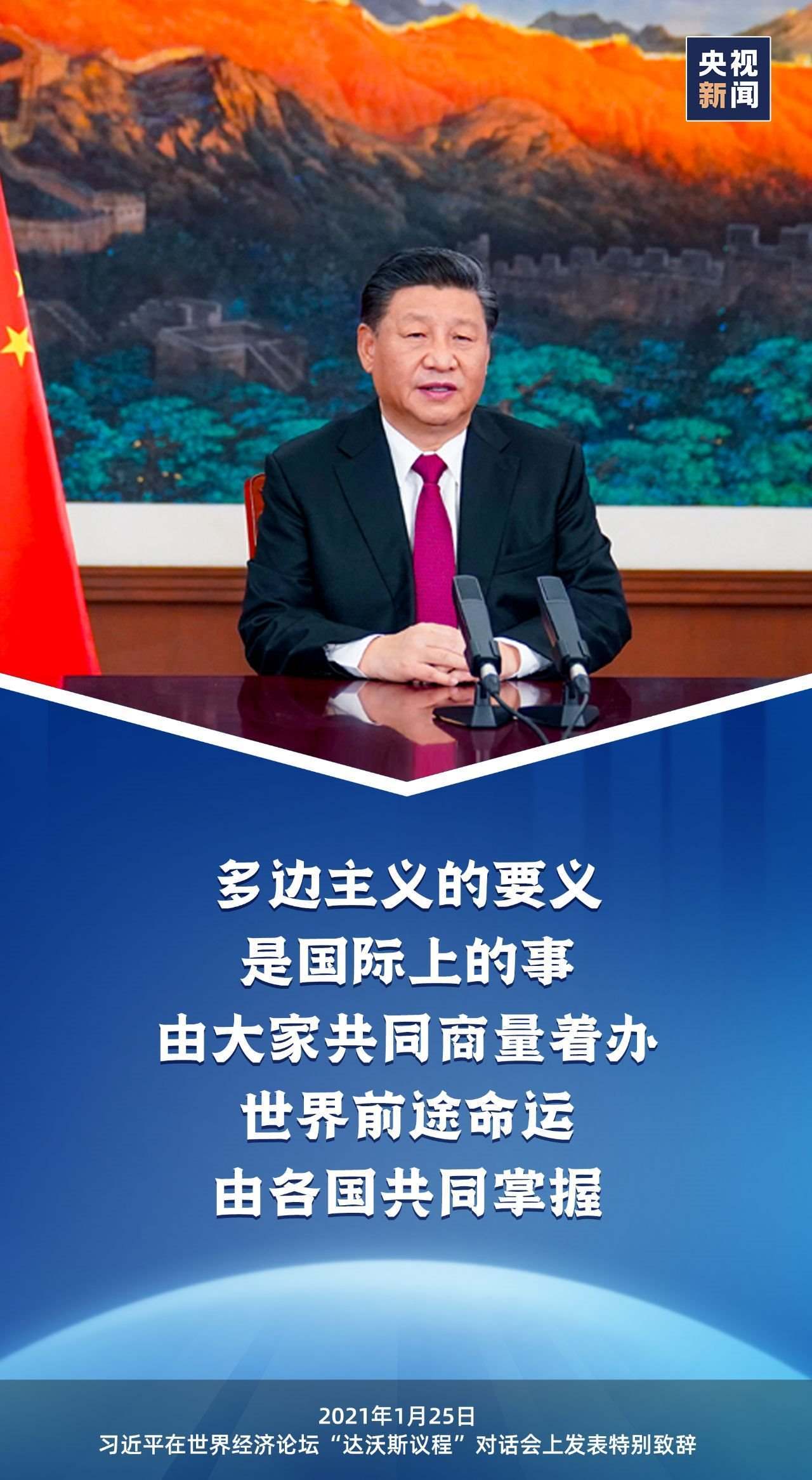 在2021年1月召開的世界經(jīng)濟(jì)論壇“達(dá)沃斯議程”對(duì)話會(huì)上,習(xí)近平主席發(fā)表特別致辭,再次強(qiáng)調(diào)踐行多邊主義,并指出“多邊主義的要義是國際上的事由大家共同商量著辦”。