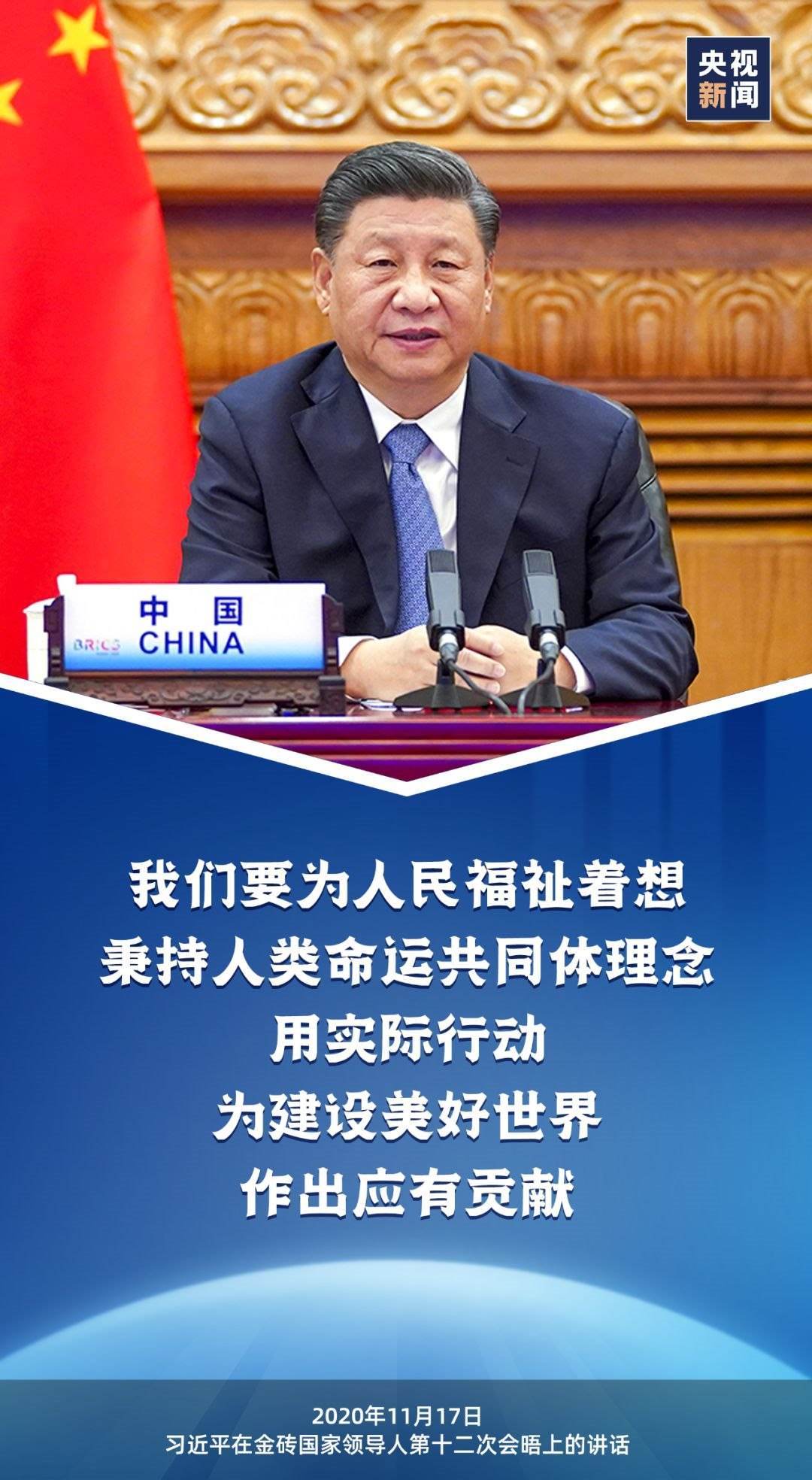 2020年11月17日,國家主席習(xí)近平出席金磚國家領(lǐng)導(dǎo)人第十二次會(huì)晤并發(fā)表重要講話時(shí)指出,“我們要為人民福祉著想,秉持人類命運(yùn)共同體理念,用實(shí)際行動(dòng)為建設(shè)美好世界作出應(yīng)有貢獻(xiàn)。”