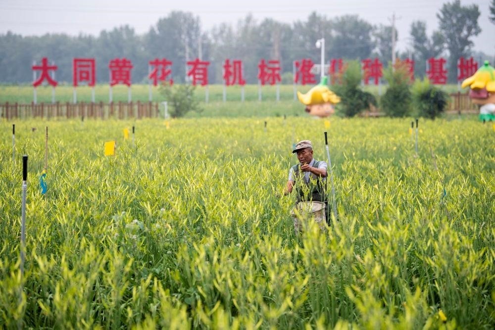 △村民在山西大同黃花有機(jī)標(biāo)準(zhǔn)化種植基地內(nèi)采摘黃花。