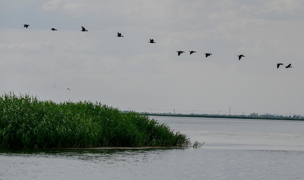 6月5日,一排候鳥在烏梁素海上空飛翔。新華社記者 連振 攝