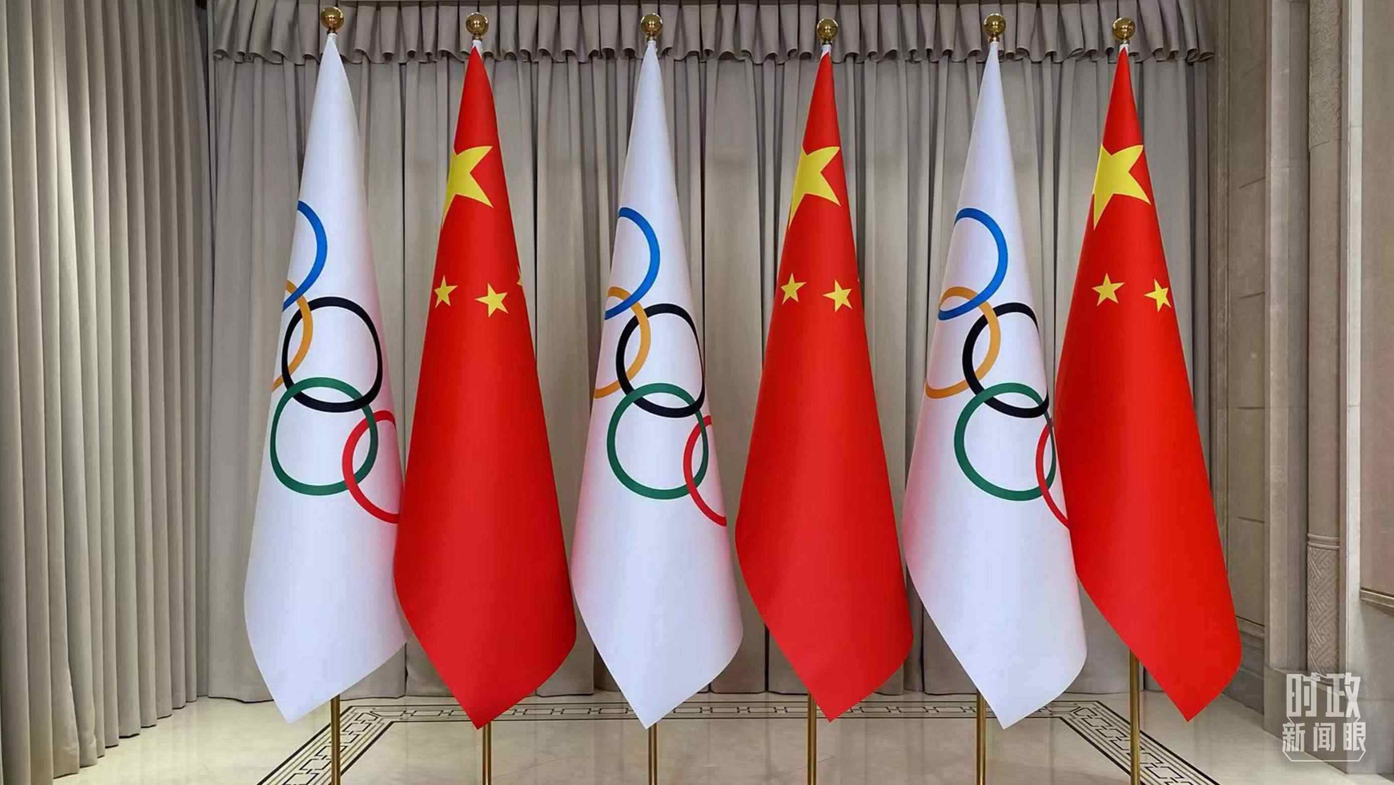 △會(huì)見現(xiàn)場(chǎng)擺放的中國(guó)國(guó)旗和奧林匹克會(huì)旗。(總臺(tái)央視記者李增仁拍攝)