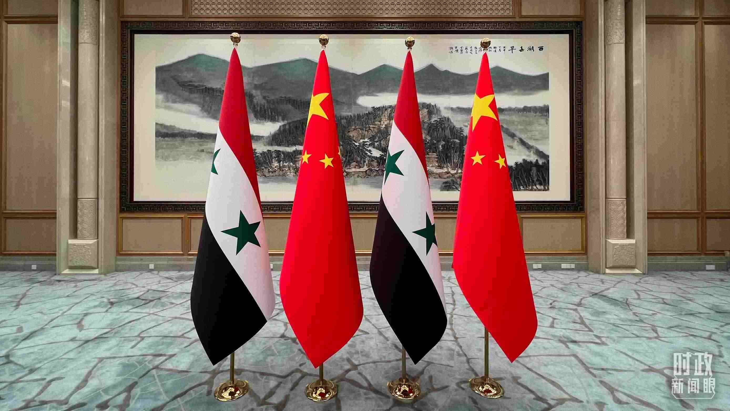 △會(huì)見現(xiàn)場(chǎng)擺放的中國(guó)、敘利亞國(guó)旗。(總臺(tái)央視記者程鋮拍攝)