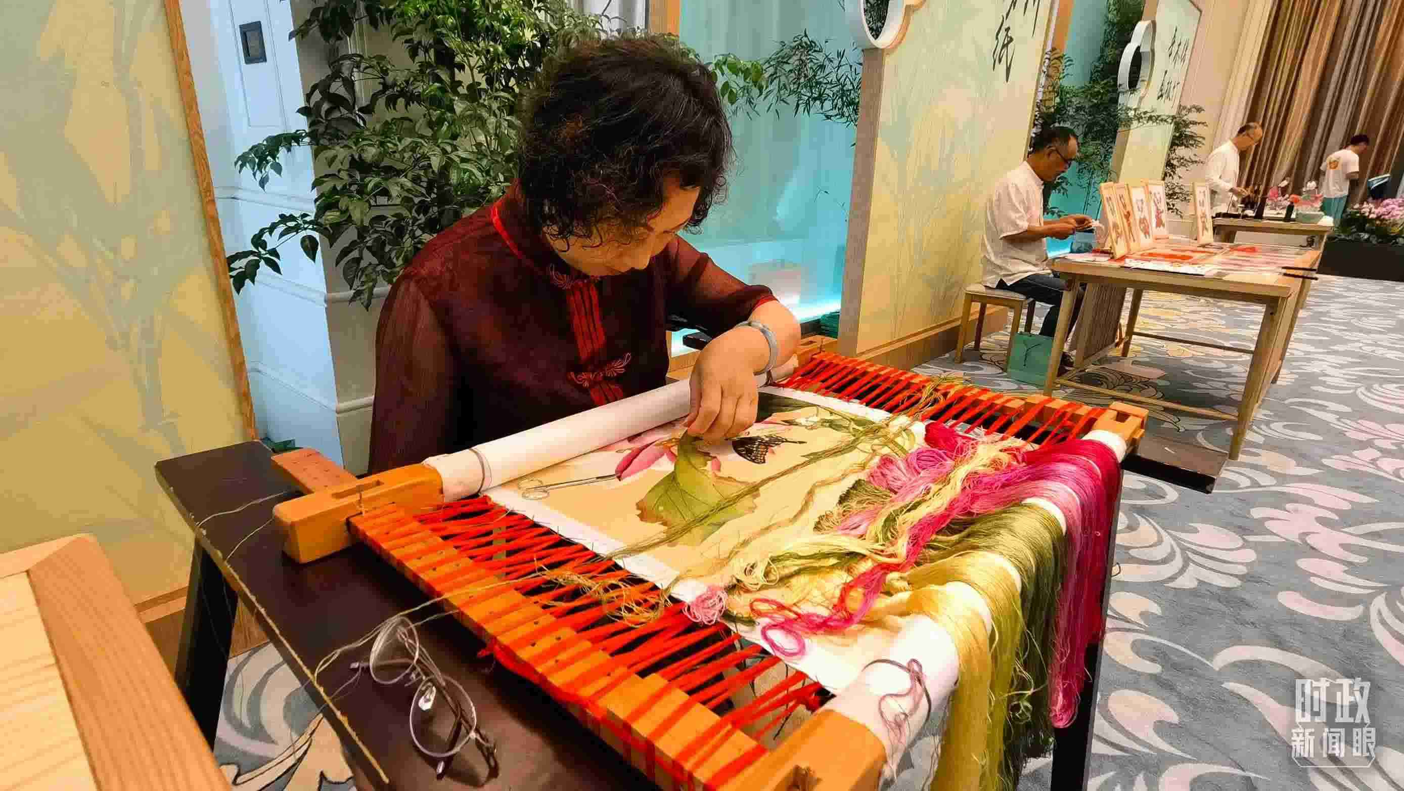 △為國際貴賓展示的四川非物質(zhì)文化遺產(chǎn)棕編和蜀繡。(總臺(tái)央視記者蔣碩、韓銳拍攝)