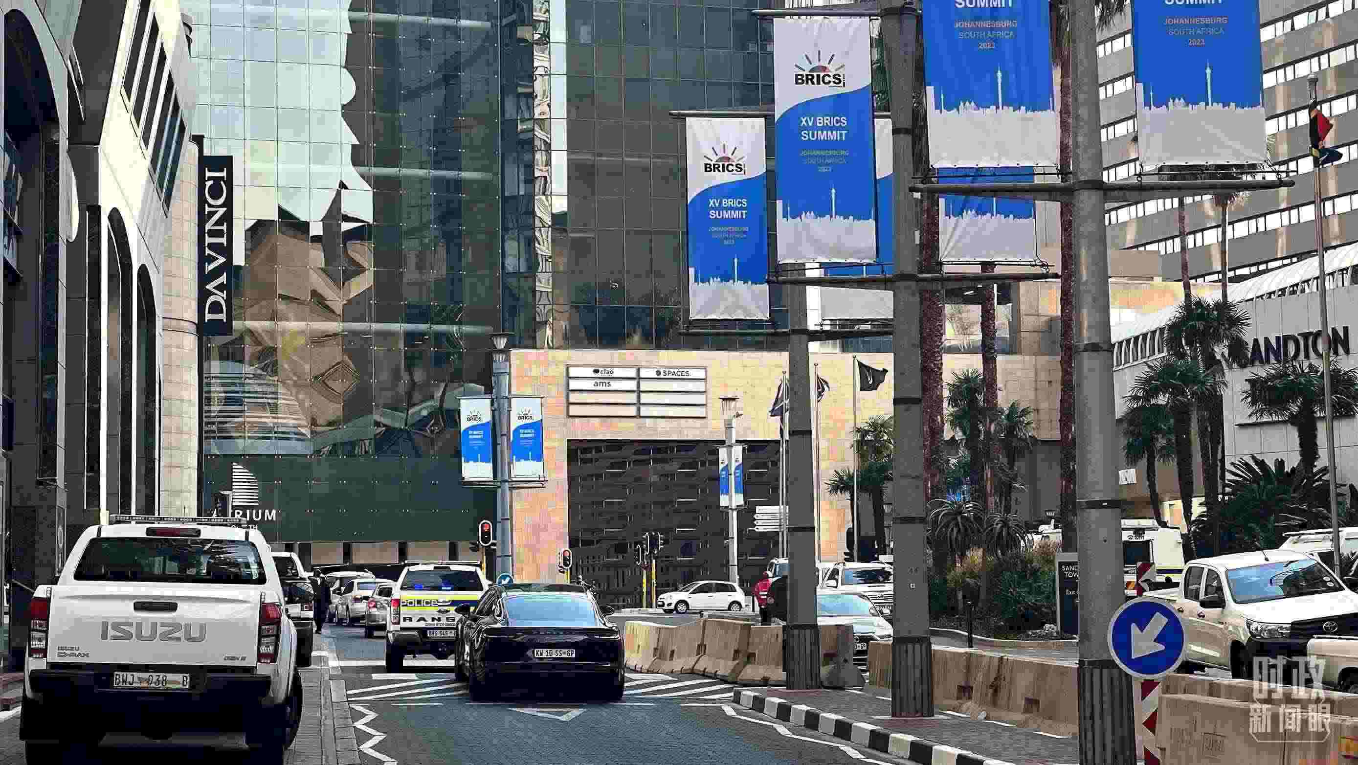 △約翰內(nèi)斯堡街道兩側(cè)懸掛的中國國旗。(總臺(tái)央視記者韓銳拍攝)