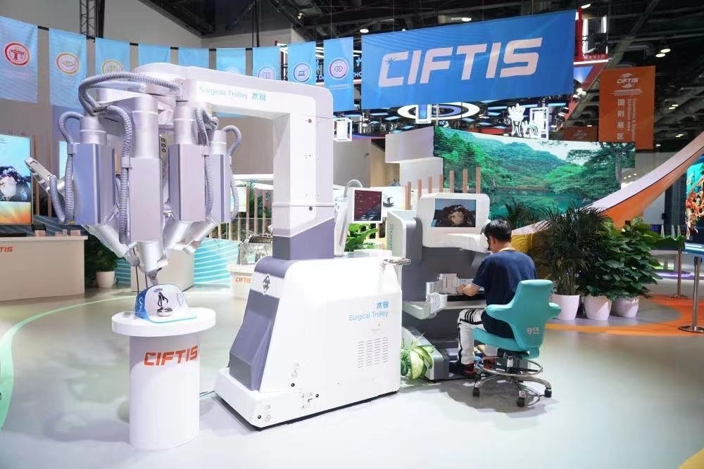 △2023年服貿(mào)會(huì)國(guó)家會(huì)議中心綜合展區(qū)展出的單孔腔鏡手術(shù)機(jī)器人