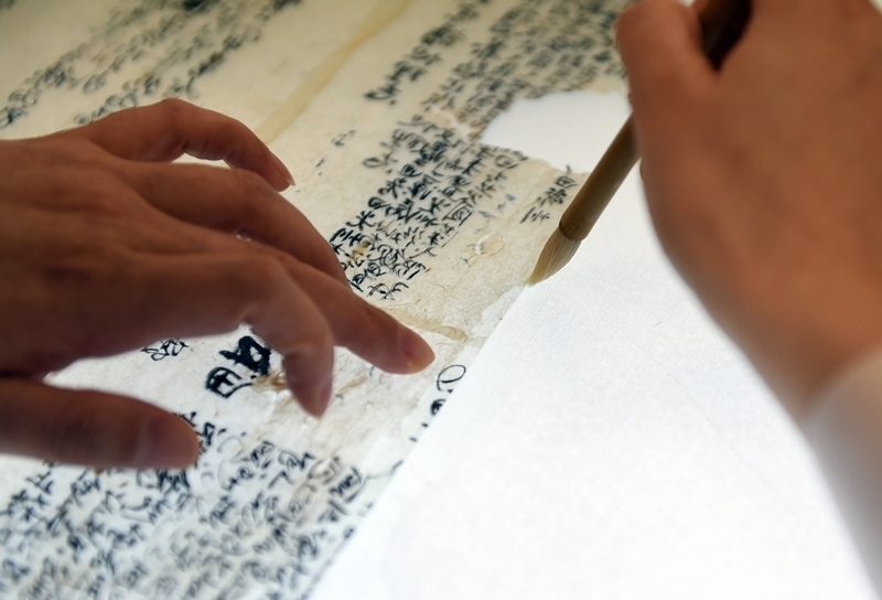 2022年5月17日,在安徽博物院文物科技保護中心紙質(zhì)文物修復室,工作人員對古籍文物進行補全。