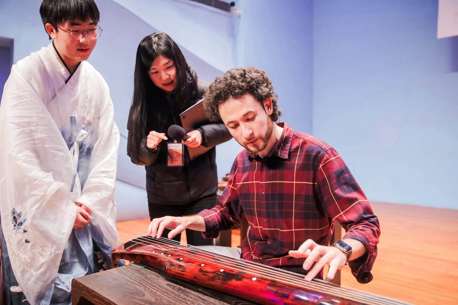 (▲俄羅斯圣彼得堡交響樂(lè)團(tuán)指揮迪米特里斯·博蒂尼斯體驗(yàn)中國(guó)古琴)