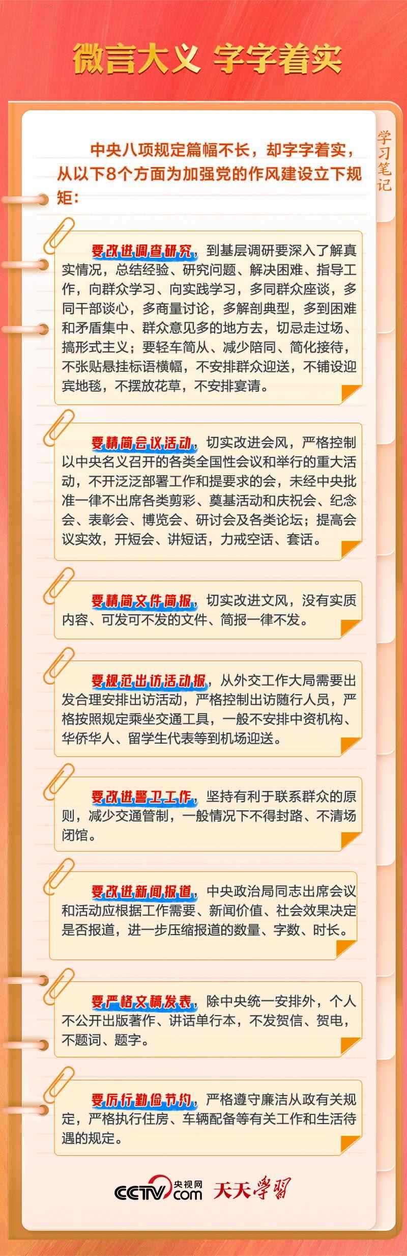 中央八項(xiàng)規(guī)定,短短600余字,涉及改進(jìn)調(diào)查研究、精簡(jiǎn)會(huì)議活動(dòng)等多方面。自出臺(tái)以來(lái),中央八項(xiàng)規(guī)定帶來(lái)的黨風(fēng)政風(fēng)社風(fēng)民風(fēng)變化,如涓涓細(xì)流,深刻影響和改變著中國(guó)。
