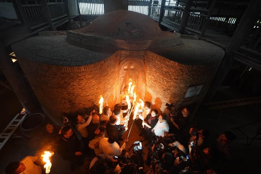 2023年10月19日,嘉賓與把樁師傅一起對(duì)葫蘆窯進(jìn)行復(fù)燒點(diǎn)火。當(dāng)日,作為2023中國景德鎮(zhèn)國際陶瓷博覽會(huì)的活動(dòng)之一,景德鎮(zhèn)古窯民俗博覽區(qū)對(duì)重建的明代葫蘆窯進(jìn)行點(diǎn)火復(fù)燒。同時(shí),景德鎮(zhèn)歷代瓷窯活態(tài)傳承紀(jì)實(shí)館開館。新華社記者 周密 攝