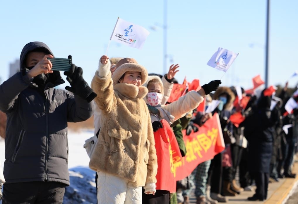 2月3日,在內(nèi)蒙古呼倫貝爾市舉行的“十四冬”火炬?zhèn)鬟f活動(dòng)上,路邊群眾揮手歡呼。新華社發(fā)(康文魁攝)