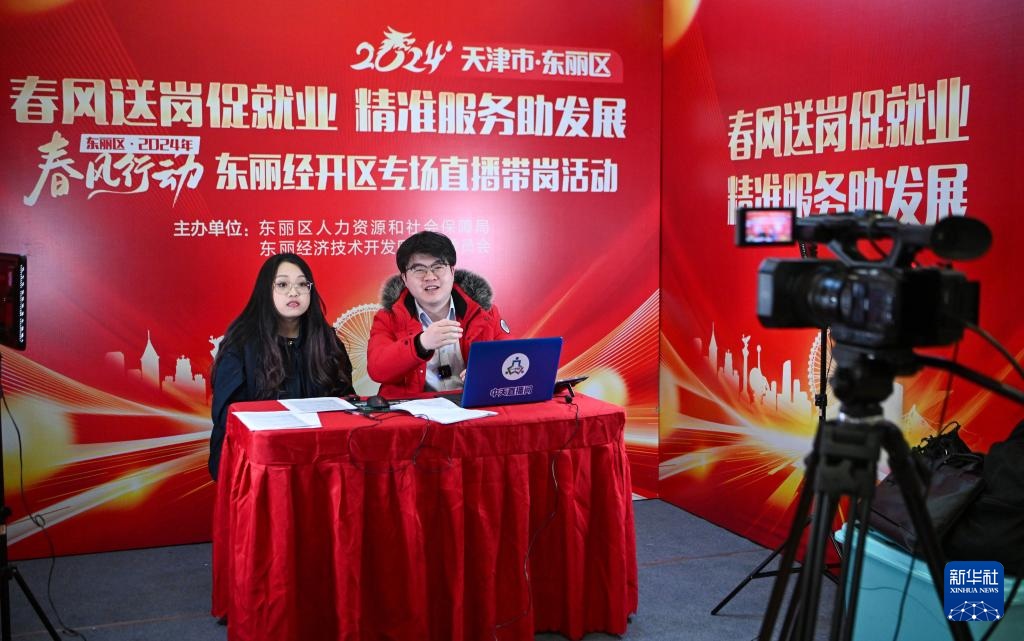??2024年2月29日,主播在天津市東麗區(qū)一場招聘會上進行直播帶崗。新華社記者 孫凡越 攝