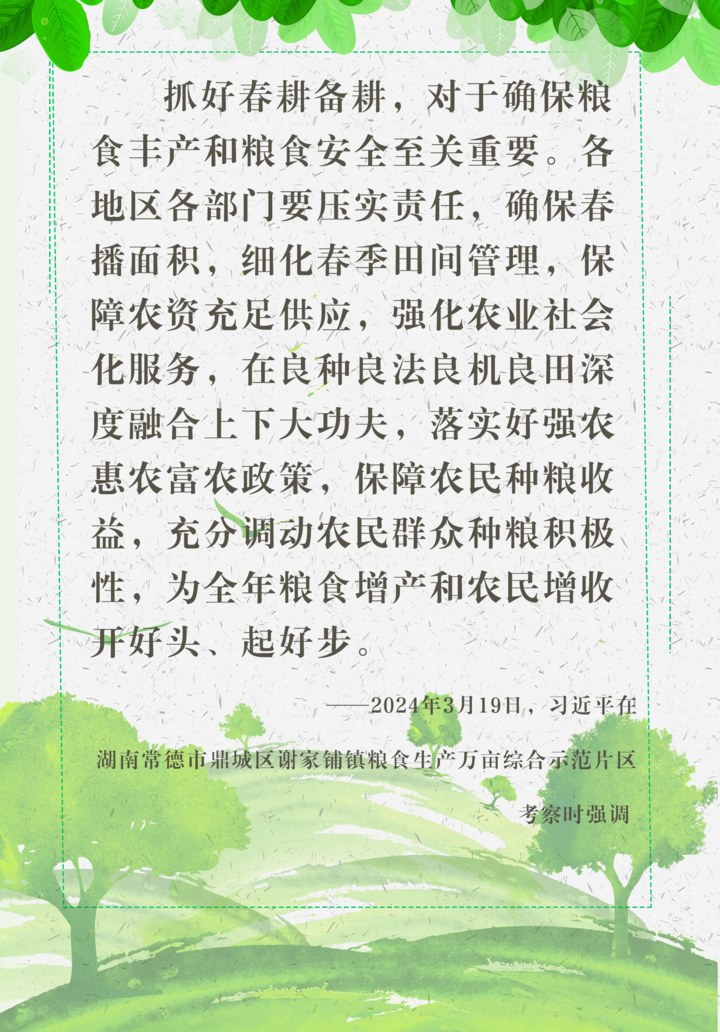 ??3月19日下午,習(xí)近平總書記來到湖南常德市鼎城區(qū)謝家鋪鎮(zhèn)糧食生產(chǎn)萬畝綜合示范片區(qū),走進(jìn)水稻田邊,察看秧苗培育和土地翻耕情況,并同種糧大戶、農(nóng)技人員、基層干部和村民親切交流,詳細(xì)詢問春耕備耕等情況。