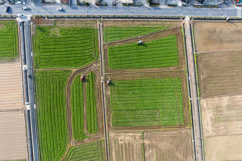 ??3月19日,在港中坪村,村民駕駛農(nóng)機(jī)翻耕田地(無人機(jī)照片)。