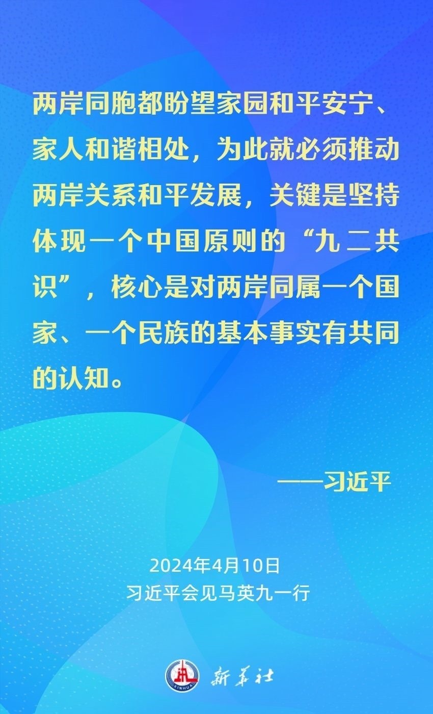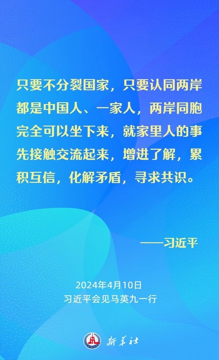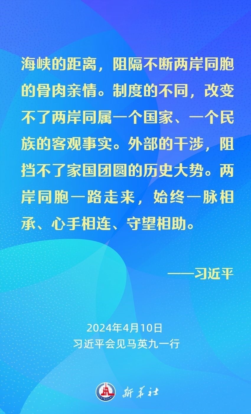 習(xí)近平強(qiáng)調(diào),兩岸同胞有共同的血脈、共同的文化、共同的歷史,更重要的是我們對民族有共同的責(zé)任、對未來有共同的期盼。我們要從中華民族整體利益和長遠(yuǎn)發(fā)展來把握兩岸關(guān)系大局。