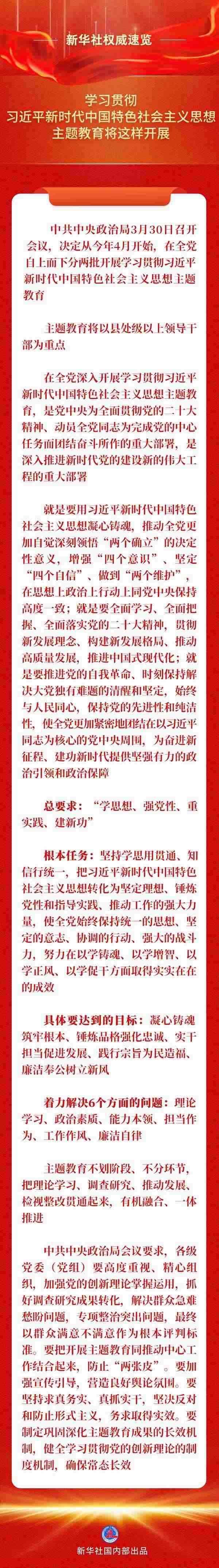 一圖速覽丨學(xué)習(xí)貫徹習(xí)近平新時(shí)代中國特色社會主義思想主題教育將這樣開展 中共中央政治局3月30日召開會議,決定從今年4月開始,......