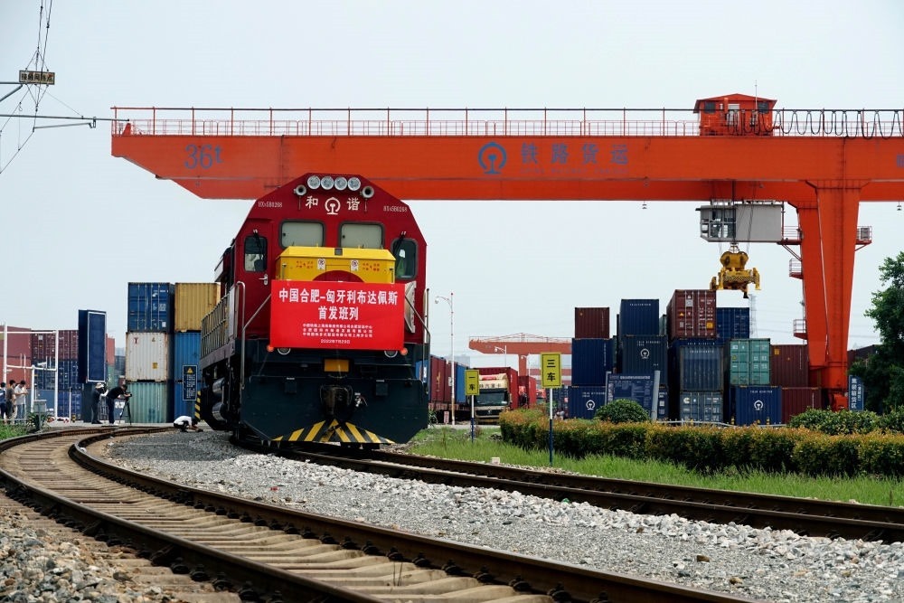 2022年7月29日,合肥至匈牙利布達佩斯的中歐班列從合肥北站物流基地駛出,標(biāo)志著合肥中歐班列通往匈牙利布達佩斯的線路正式開通。新華社發(fā)(席靜玉 攝)
