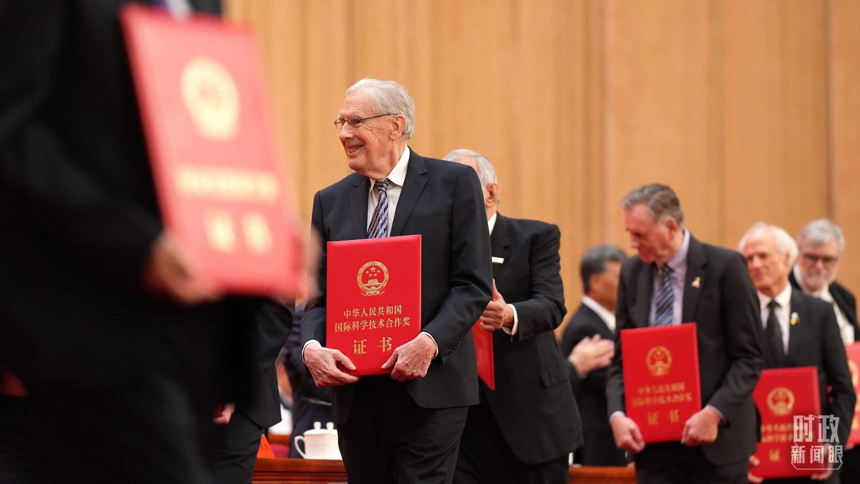 △獲獎的外籍科技工作者,獎?wù)碌谋趁婵逃蝎@獎?wù)咝彰#偱_國廣記者李晉、央視記者姚瑤拍攝)