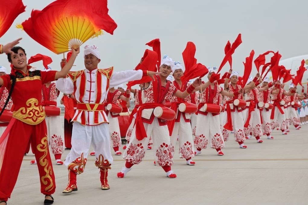 2023年5月17日下午,出席中國-中亞峰會的哈薩克斯坦總統(tǒng)托卡耶夫抵達陜西省西安市。當(dāng)?shù)孛癖娨詿崆榈难?、歡快的秧歌等民間藝術(shù)表演歡迎貴賓到來。新華社記者 邢廣利 攝