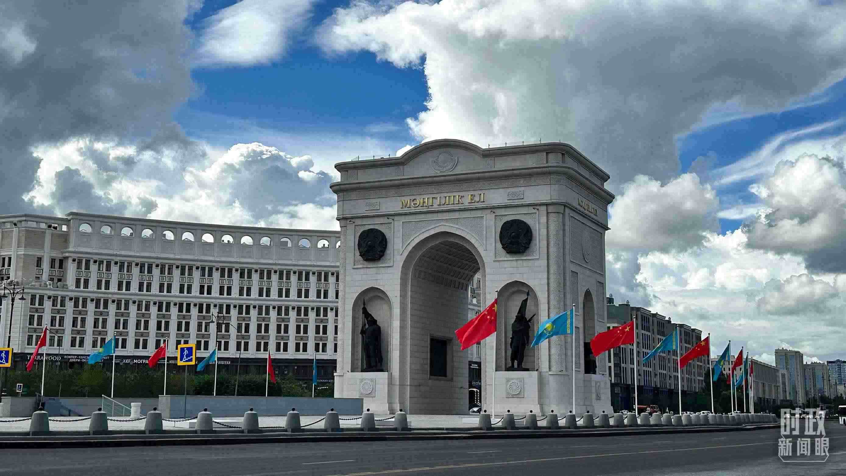 △阿斯塔納地標(biāo)建筑“凱旋門”兩側(cè),中哈兩國國旗迎風(fēng)招展。(總臺央視記者關(guān)舟拍攝)