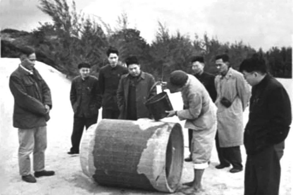 △ 谷文昌在湖尾地下水工地與工程技術(shù)人員一起試驗(yàn)濾水管。