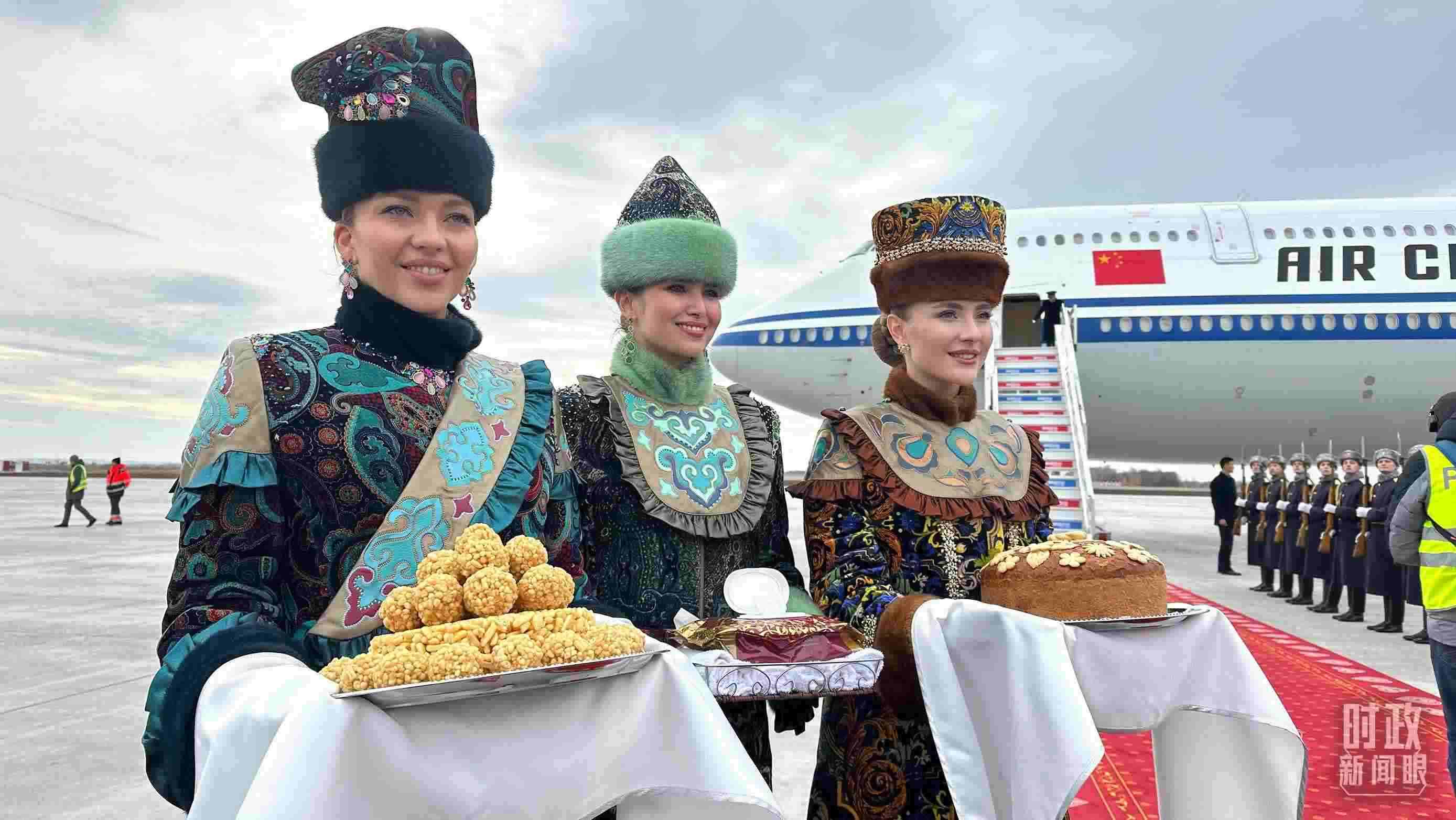 △ 習(xí)主席專機抵達喀山國際機場時,禮兵在紅毯兩側(cè)列隊致敬,身著民族服裝的俄羅斯女青年用傳統(tǒng)禮節(jié)表示歡迎。(總臺央視記者盧心雨拍攝)