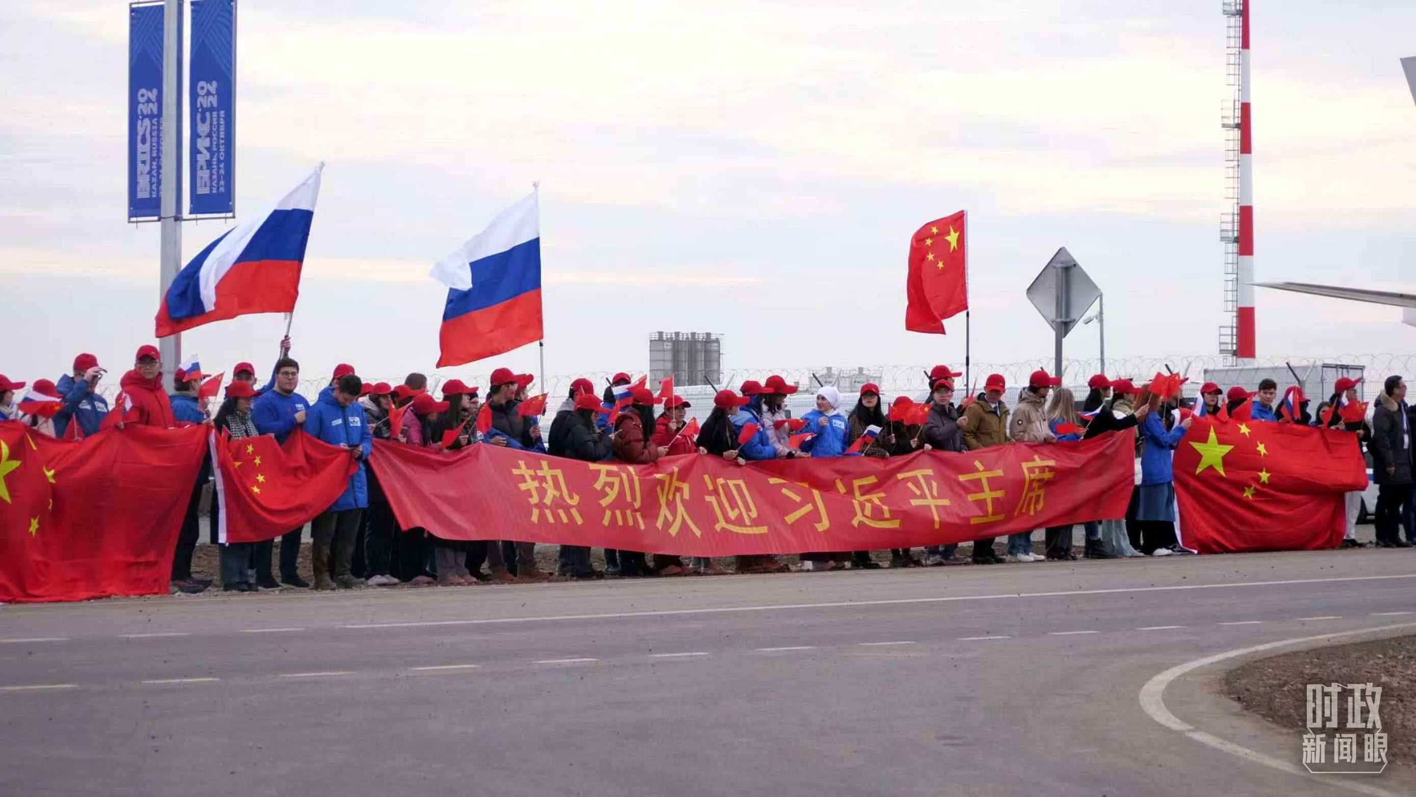 △ 俄羅斯喀山各界人士揮舞中俄兩國國旗,歡迎習(xí)主席到訪。(總臺記者蔣泓橋拍攝)