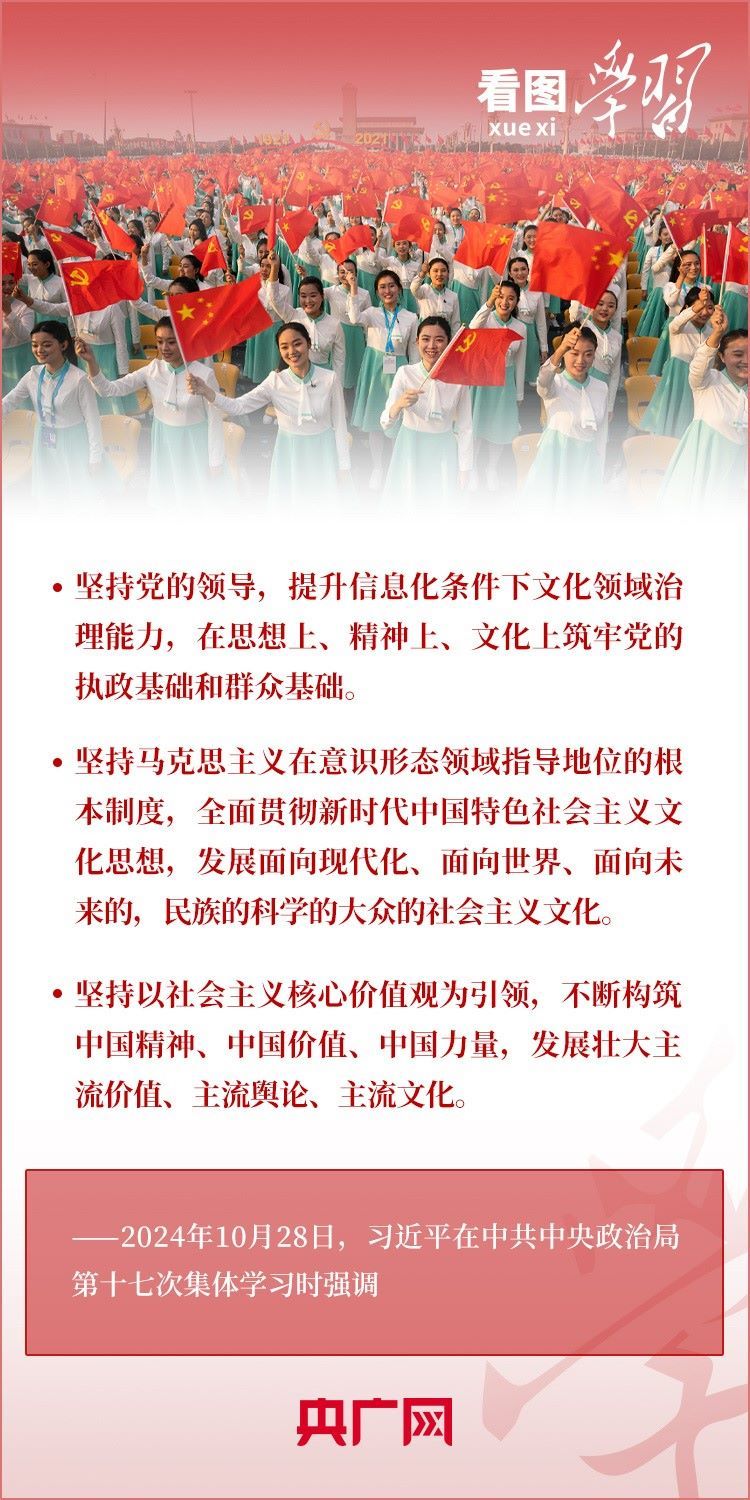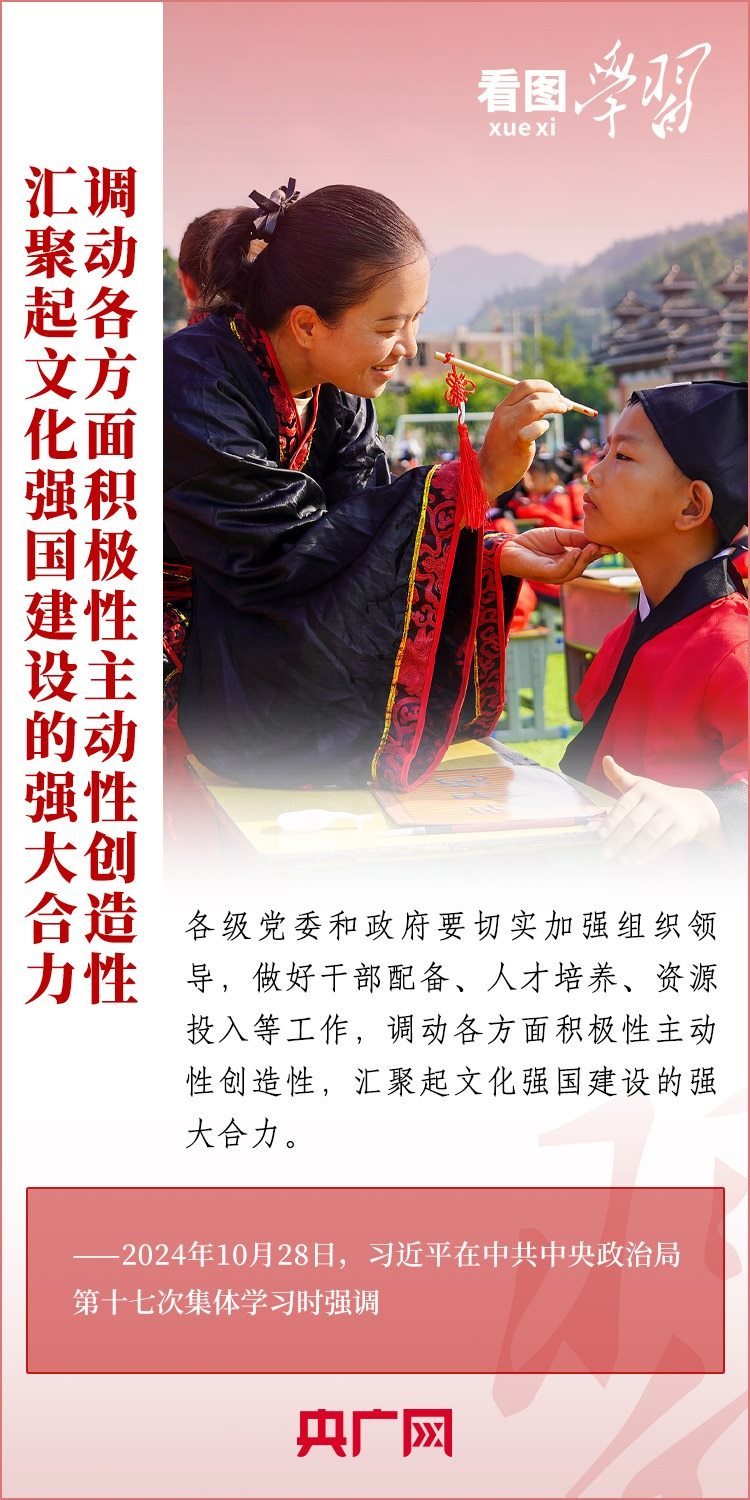建設(shè)文化強(qiáng)國是全黨全社會(huì)的共同任務(wù)。10月28日,中共中央政治局就建設(shè)文化強(qiáng)國進(jìn)行第十七次集體學(xué)習(xí)。習(xí)近平總書記在聽取講解和討論后發(fā)表重要講話,就錨定2035年建成文化強(qiáng)國戰(zhàn)略目標(biāo)作出最新部署,強(qiáng)調(diào)要“不斷發(fā)展具有強(qiáng)大思想引領(lǐng)力、精神凝聚力、價(jià)值感召力、國際影響力的新時(shí)代中國特色社會(huì)主義文化,不斷增強(qiáng)人民精神力量,筑牢強(qiáng)國建設(shè)、民族復(fù)興的文化根基。”一起來學(xué)習(xí)!