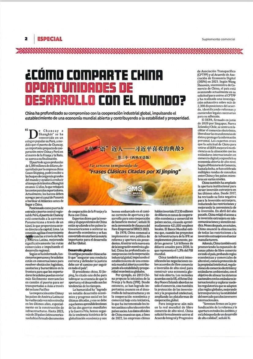11月14日,秘魯最具影響力的官方報紙《秘魯人報》刊發(fā)節(jié)目在秘魯落播的消息。文章指出,《平“語”近人——習近平喜歡的典故》第三季展現(xiàn)了中華民族開放包容、兼收并蓄的文化胸懷,闡釋了習近平主席提出的推動構(gòu)建人類命運共同體的這一重大理念,是對“建設(shè)一個什么樣的世界、怎樣建設(shè)這個世界”給出的中國方案?!睹佤斎藞蟆诽乜婵l(fā)《平“語”近人——習近平喜歡的典故》第三季(西班牙語版)將在秘魯主流媒體落播特稿?!睹佤斎藞蟆饭倬W(wǎng)也同步刊發(fā)了節(jié)目預(yù)告消息和海報。