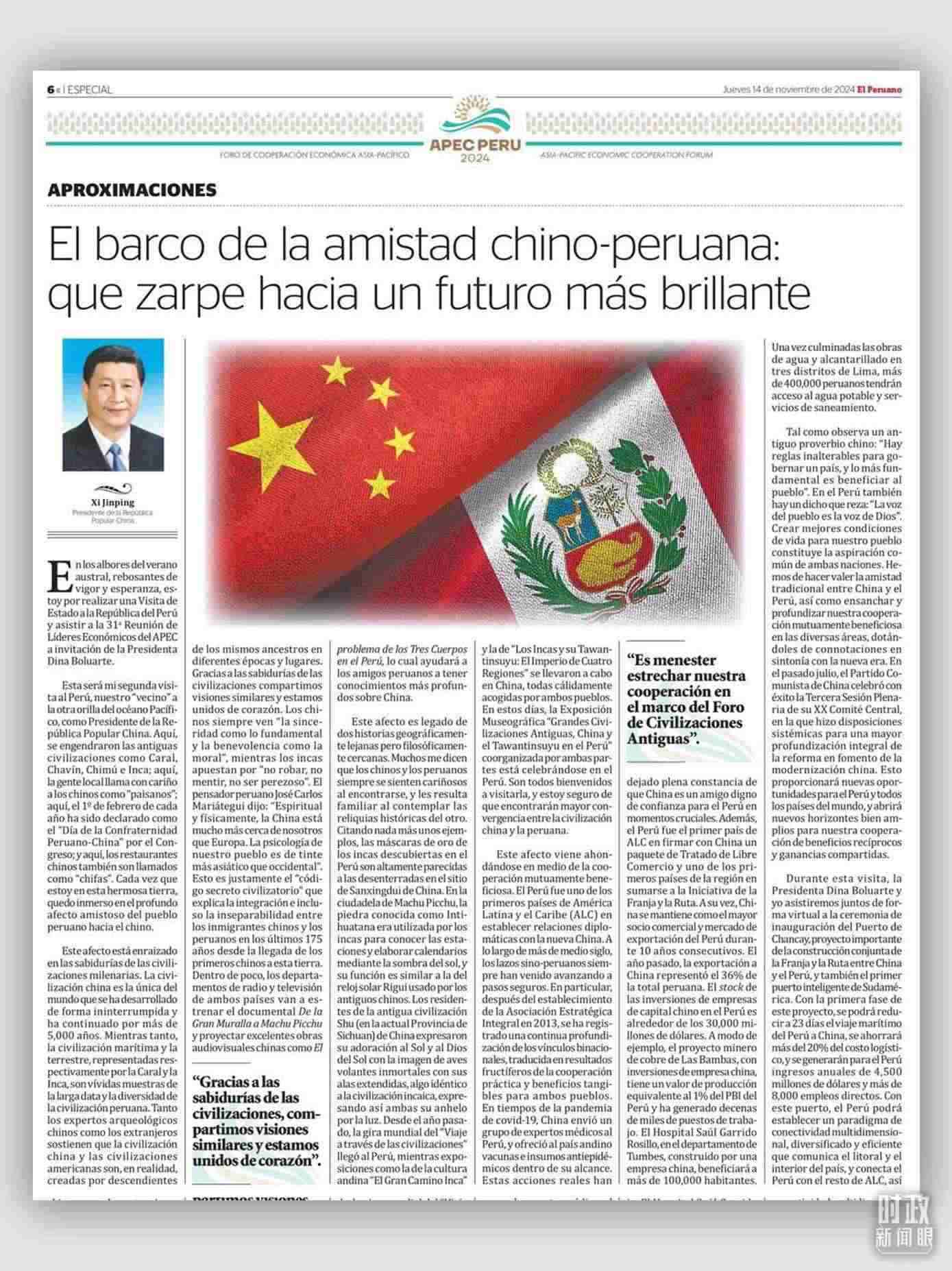 △習(xí)主席在《秘魯人報(bào)》發(fā)表題為《讓中秘友好之船揚(yáng)帆遠(yuǎn)航》的署名文章。(總臺(tái)國廣記者吳倩)