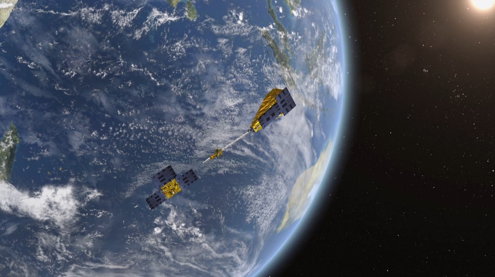 “澳科一號”衛(wèi)星在軌示意圖(右為A星,左為B星)。圖片由澳門科技大學(xué)“澳科一號”團(tuán)隊(duì)提供