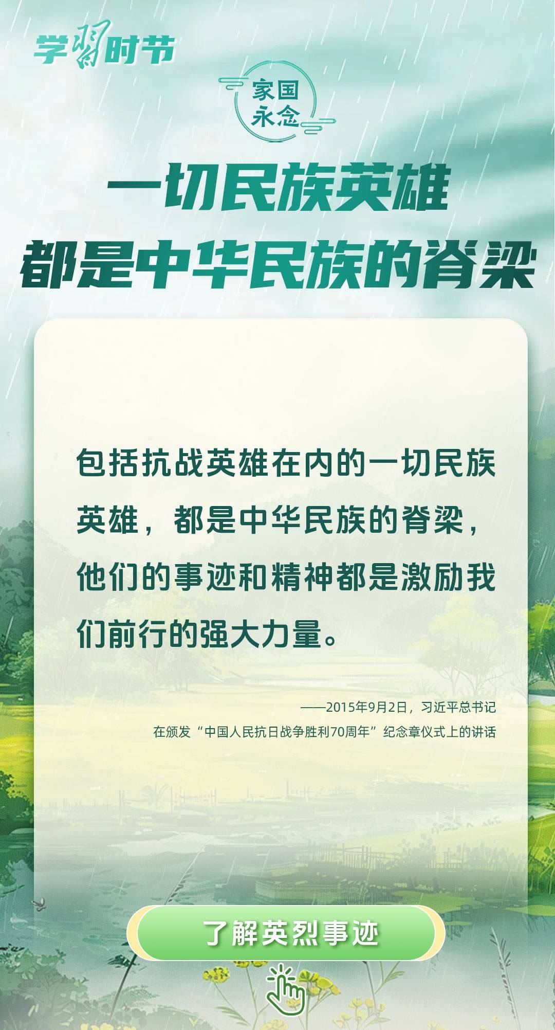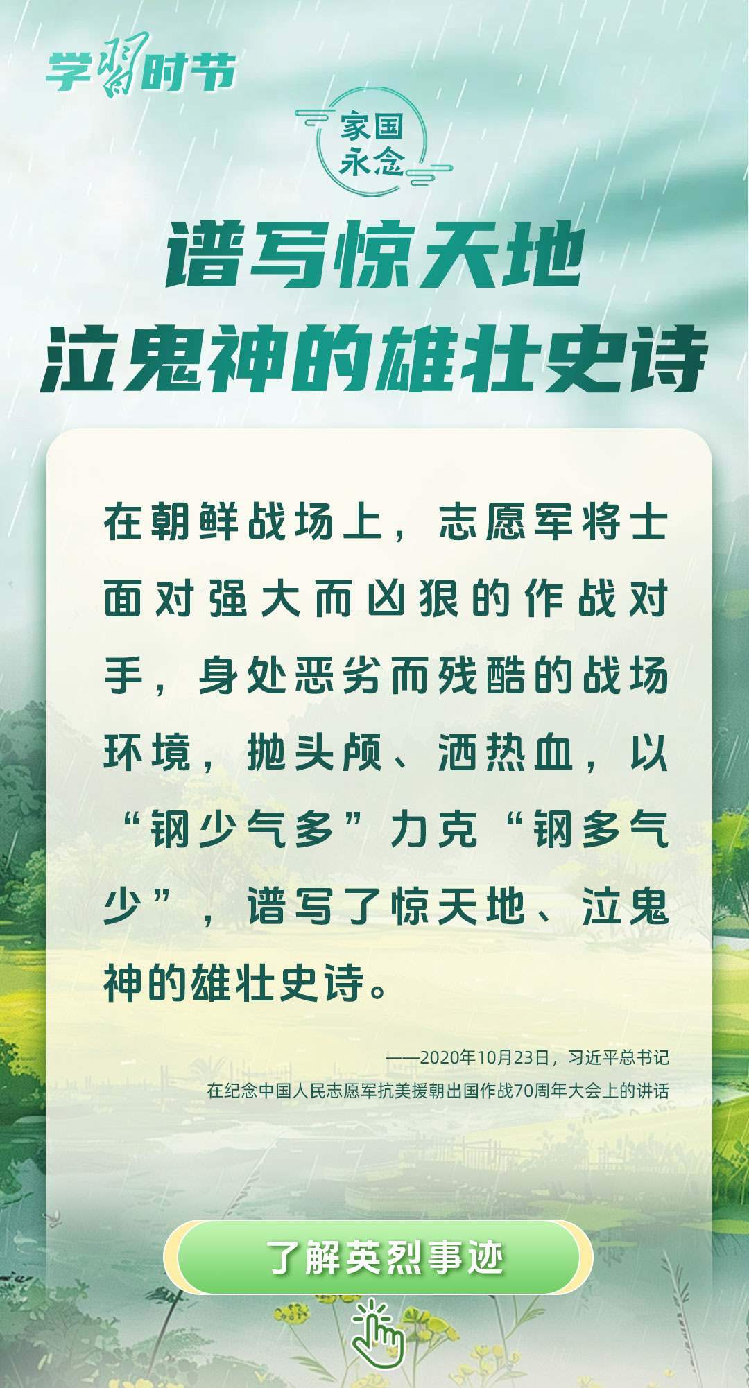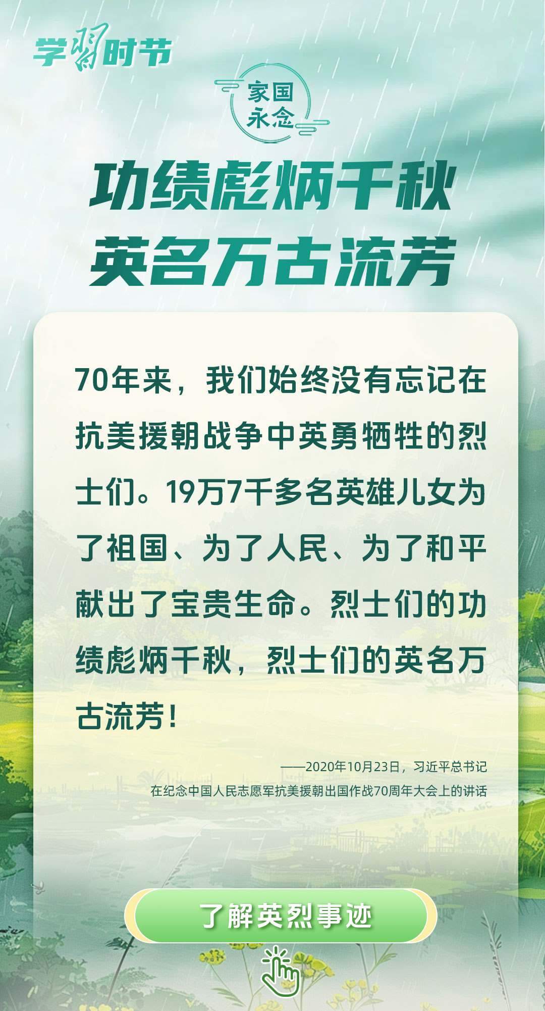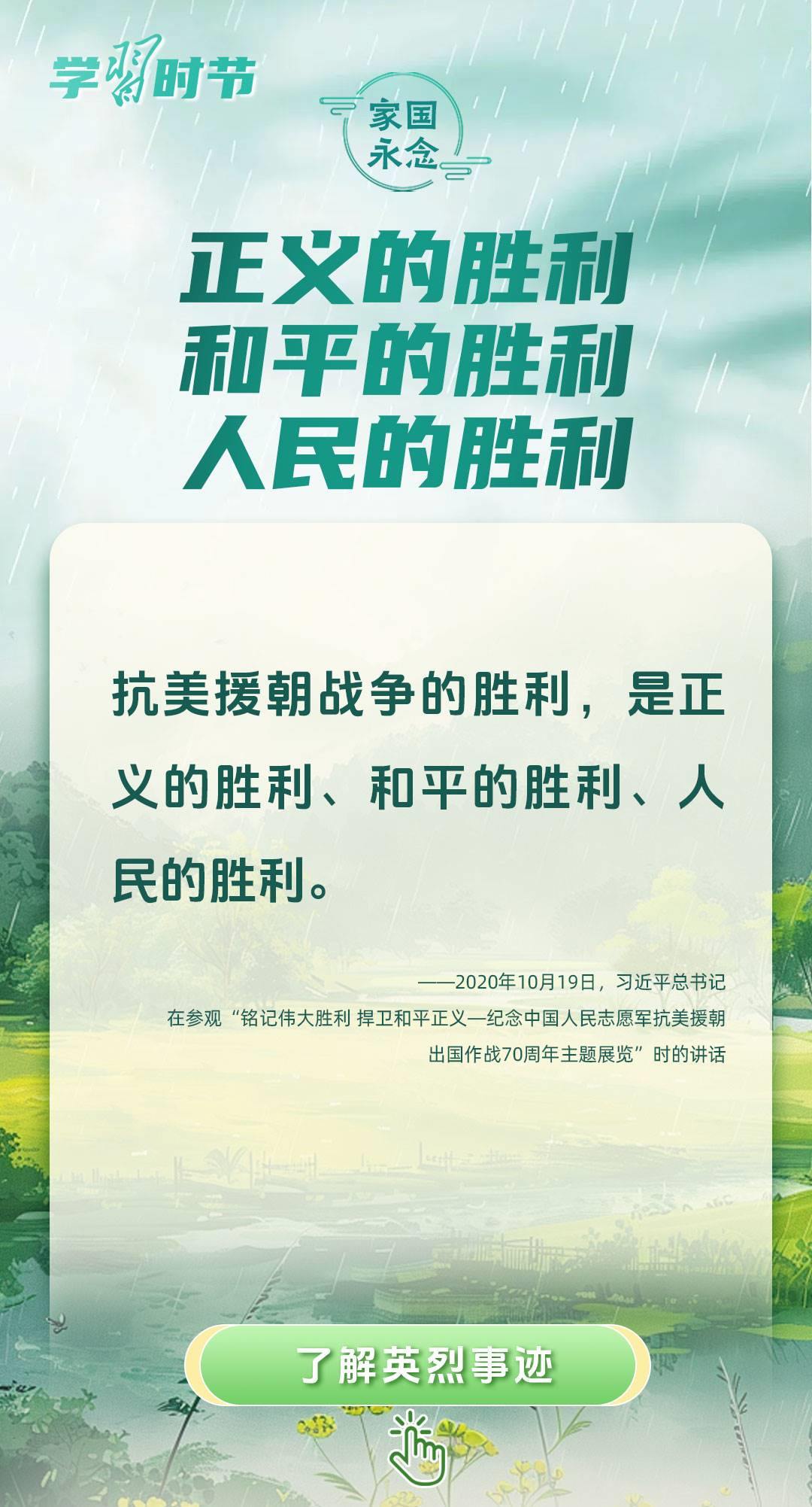 今年是中國人民抗日戰(zhàn)爭暨世界反法西斯戰(zhàn)爭勝利80周年、中國人民志愿軍抗美援朝出國作戰(zhàn)75周年。習近平總書記曾說:“對一切為國家、為民族、為和平付出寶貴生命的人們,不管時代怎樣變化,我們都要永遠銘記他們的犧牲和奉獻?!苯裉煳覀兯鶕碛械囊磺校瑹o不凝結著英雄、英烈們的奉獻付出乃至巨大犧牲。