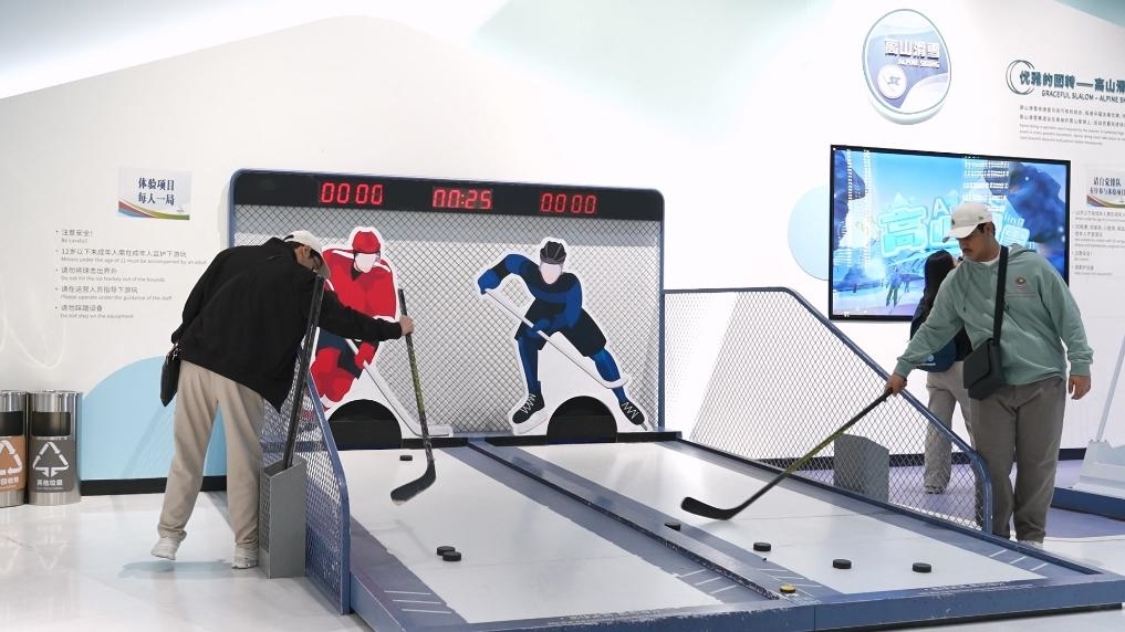 4月6日,北京奧運(yùn)博物館,阿聯(lián)酋學(xué)生們體驗(yàn)?zāi)M冰球。新華社記者 胡震澤 攝